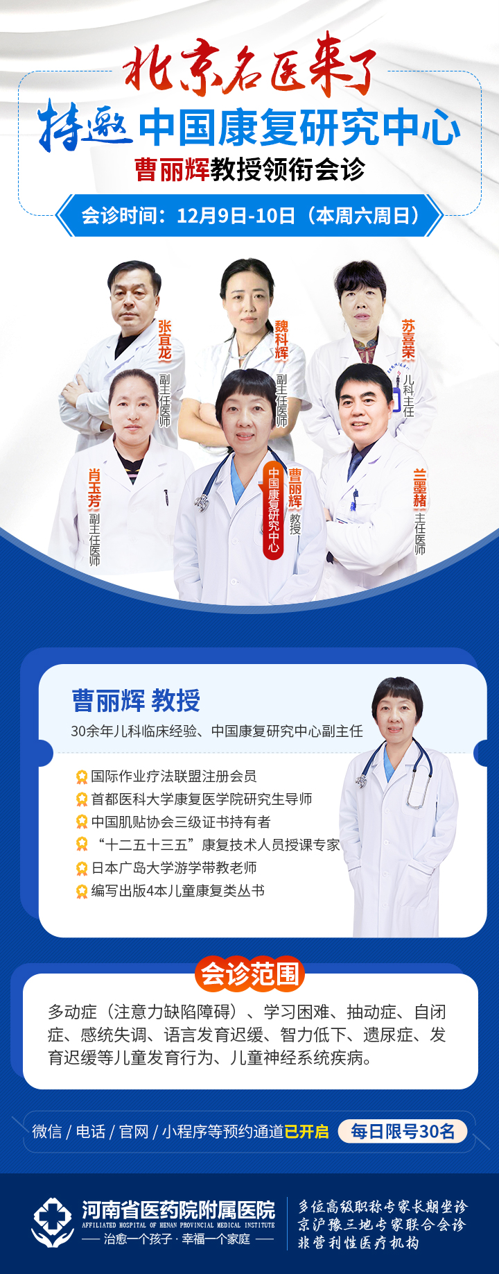 北京市专家会诊|12月9日-10日中国康复研究中心曹丽辉教授亲自联合会诊,面对面帮助孩子健康成长。“小孩子一刻静不下来,在其中考试又铺底,这可如何是好?”“没有耐心、脾气大,一言不和下手,这月被班主任叫去了4回了..” “都快要6岁的人了依然说不清楚话,小学入学不会受到影响吧!”